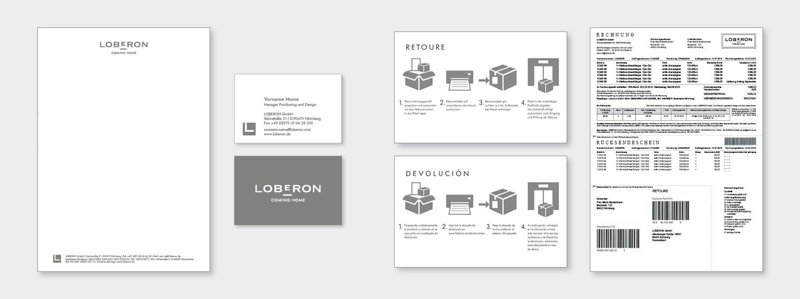 Das Markenzeichen von LOBERON zeigt einen Schriftzug mit einem kleineren E, unterlegt durch einen Strich mittig zum Schriftzug an sich. So wird der Eingang in ein Haus, ein Entrée in die Welt von LOBERON symbolisiert.
